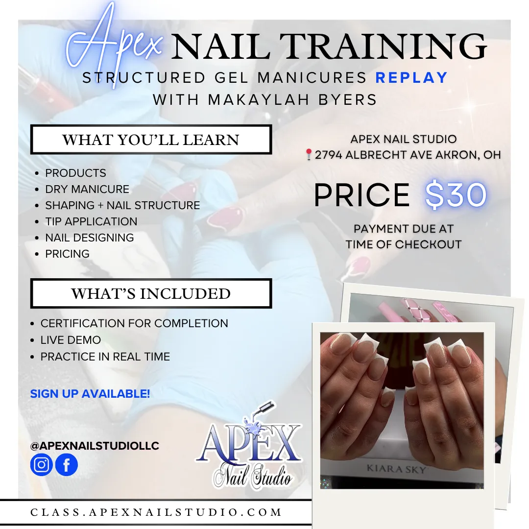 Join Makaylah Byers in this professional replay session and learn step-by-step how to elevate your nail services, boost client satisfaction, and build confidence behind the table — all from the comfort of your own space.